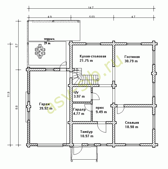 Проект коттеджа из оцилиндрованного бревна с гаражом ОБ-269